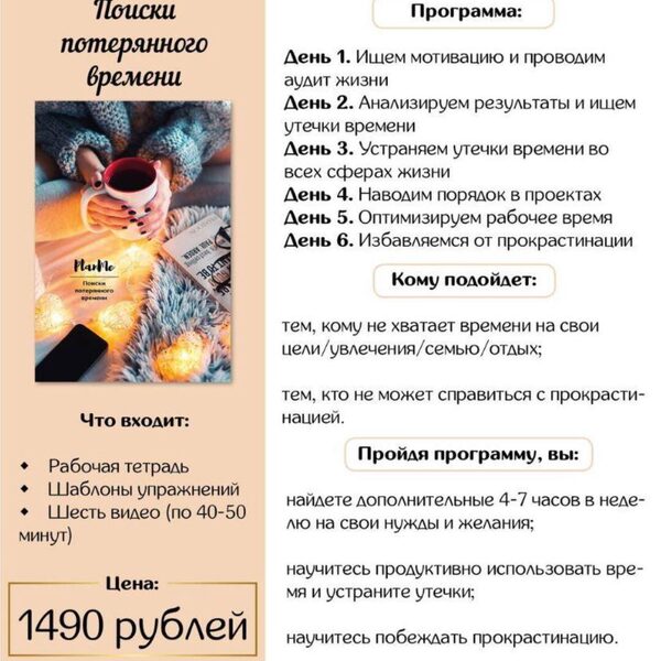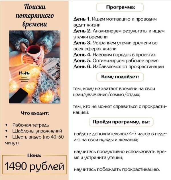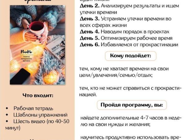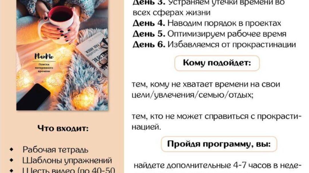 Я последний месяц провела за подготовкой к марафону, который точно решит проблему «У меня нет времени». И я знаю, о чем говорю, потому что сама ежедневно совмещаю развитие своего дела, цели, семью и 7+ увлечений, при этом позволяю себе спать до обеда и наслаждаться жизнью, никуда не спешить.
