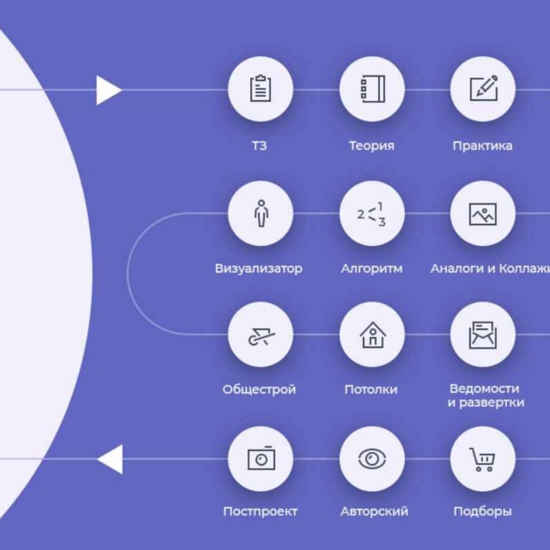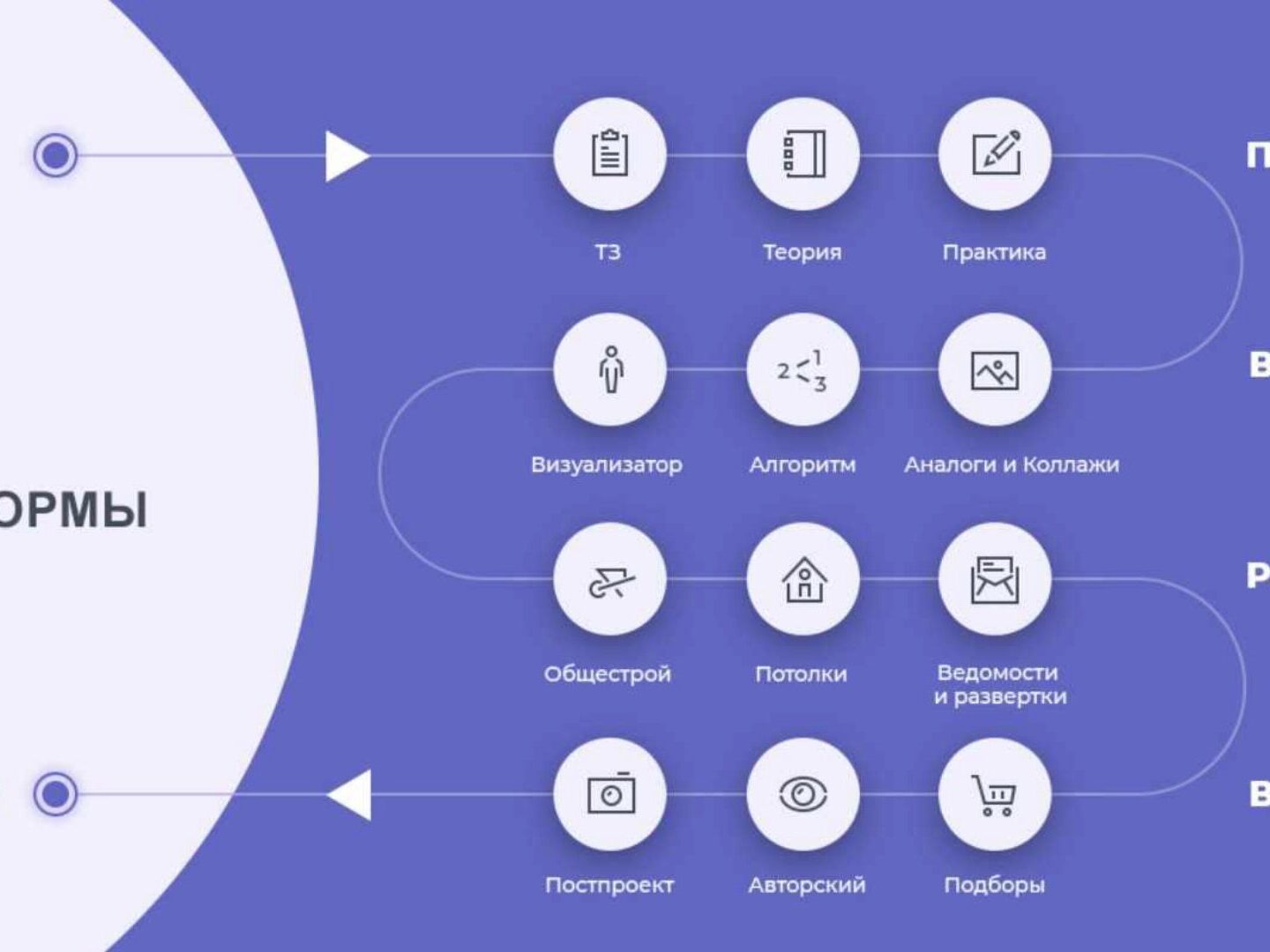 Программа обучения продиктована жизнью. Работа дизайнера интерьера делится на 4 части: планировки, 3D-визуализации, рабочая документация и воплощение.