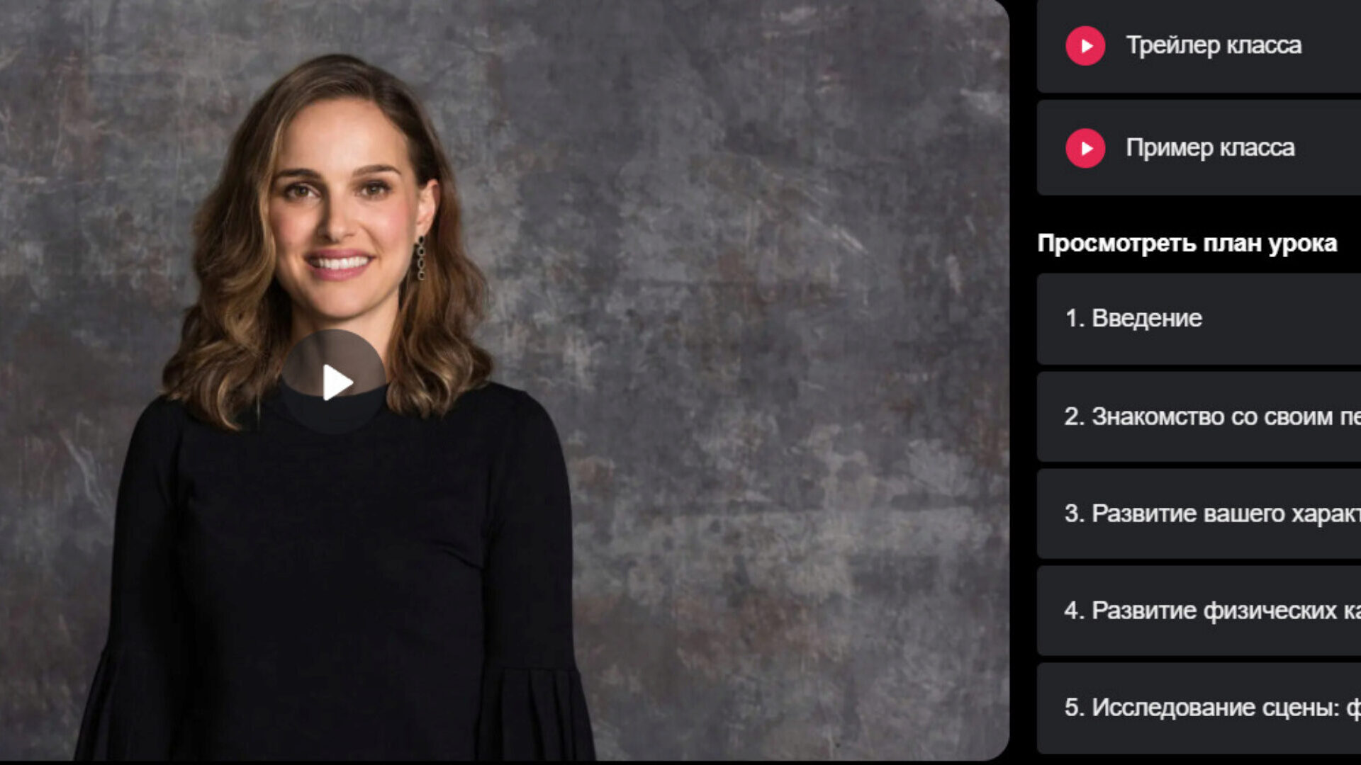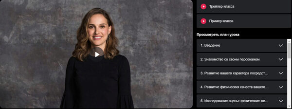 Курс переведён на русский язык. Натали Портман начала профессионально сниматься в 12 лет и получила премию «Оскар» еще до того, как ей исполнилось 30 лет. Будучи актрисой-самоучкой, она использует собственные техники для создания убедительных, сложных персонажей. На первом в своей жизни