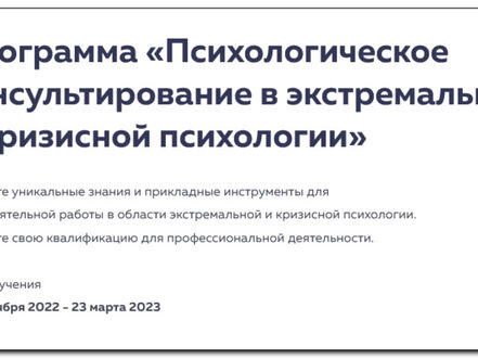 Невозможно предположить, с чего начнётся кризис и где он вас настигнет. Но страшно только то, что неизвестно. Поэтому мы собрали в одном месте все знания о кризисах, стрессе и их воздействии на человека. Представляем новую программу «Психологическое консультирование в экстремальной и кризисной психологии» с присуждением квалификации «Кризисный психолог».