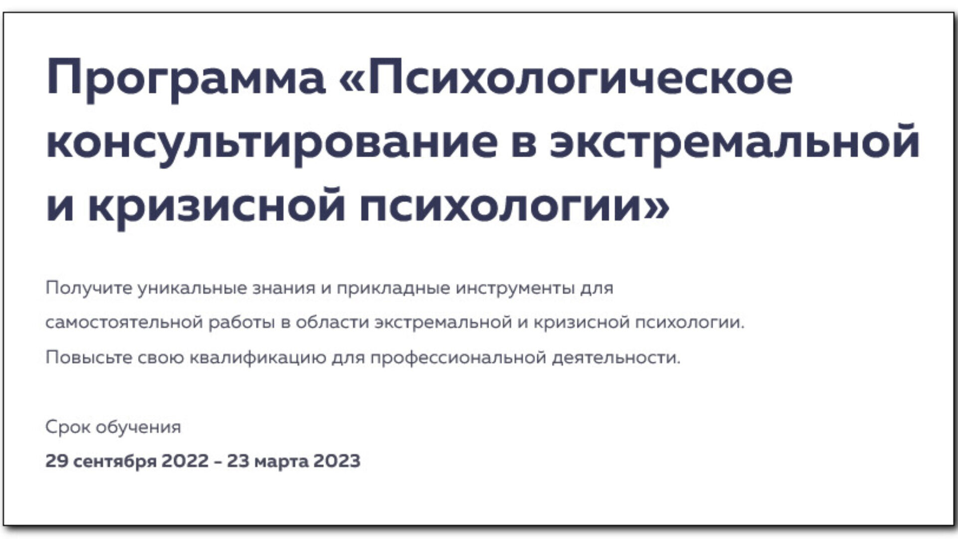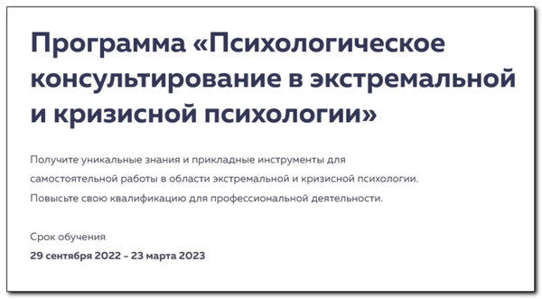 Программа «Психологическое консультирование в экстремальной и кризисной психологии». Для студентов и выпускников программы «Психологическое консультирование по методике PSY2.0», в объеме 1100 академ.часов, стоимость 70 000 Р. Программа сертификата 465 академ.часов Получите уникальные знания и