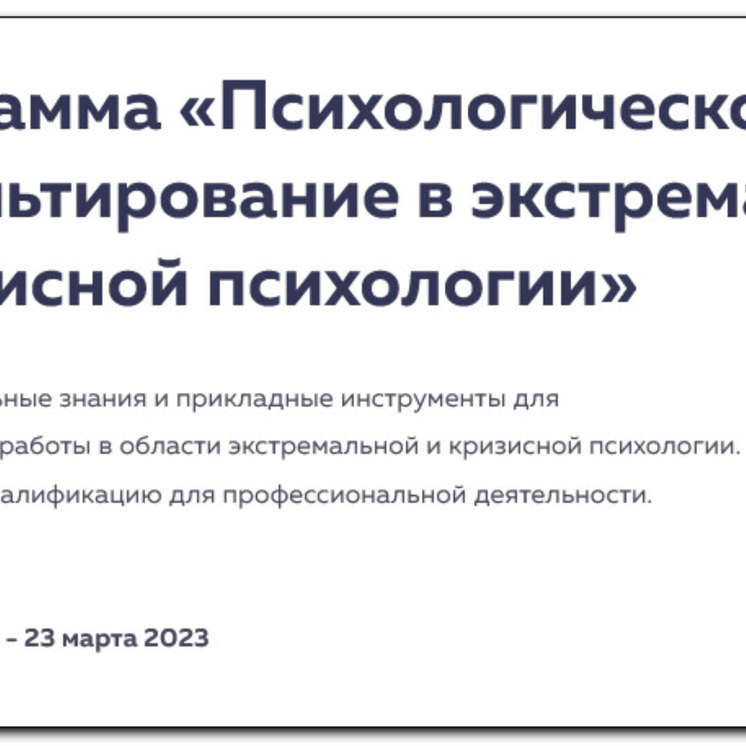 Программа «Психологическое консультирование в экстремальной и кризисной психологии» PSY2.0 Это складчина на 1-й месяц программы (курса) Получите уникальные знания и прикладные инструменты для самостоятельной работы в области экстремальной и кризисной психологии. Повысьте свою квалификацию для