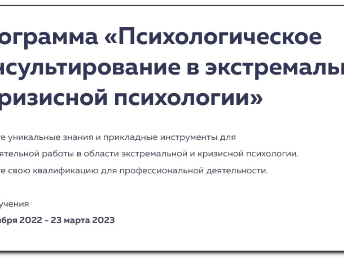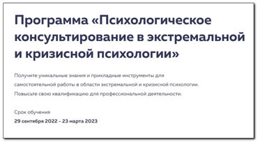 Программа «Психологическое консультирование в экстремальной и кризисной психологии». Для студентов и выпускников программы «Психологическое консультирование по методике PSY2.0», в объеме 1100 академ.часов, стоимость 70 000 Р. Программа сертификата 465 академ.часов Получите уникальные знания и