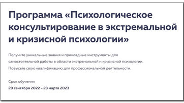 Невозможно предположить, с чего начнётся кризис и где он вас настигнет. Но страшно только то, что неизвестно. Поэтому мы собрали в одном месте все знания о кризисах, стрессе и их воздействии на человека. Представляем новую программу «Психологическое консультирование в экстремальной и кризисной психологии» с присуждением квалификации «Кризисный психолог».