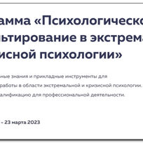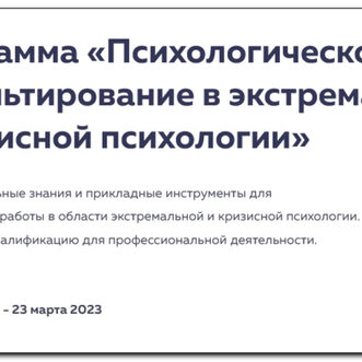 Программа «Психологическое консультирование в экстремальной и кризисной психологии» PSY2.0 Это складчина на 2-й месяц программы (курса) Получите уникальные знания и прикладные инструменты для самостоятельной работы в области экстремальной и кризисной психологии. Повысьте свою квалификацию для