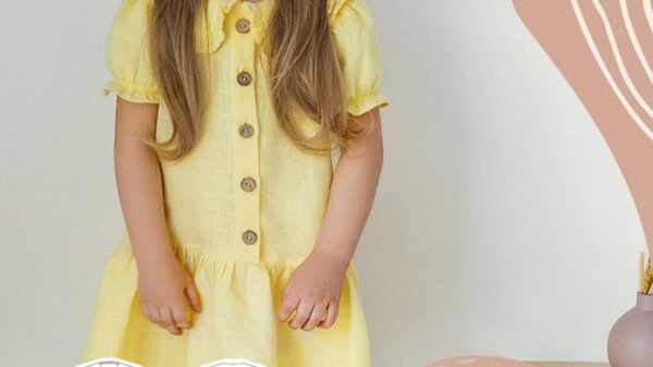 Платье детское среднего объема, отрезное по линии талии. Линия талии слегка завышена. Округлый вырез горловины оформлен оборкой. На переде лифа фигурная кокетка. По линии втачивания кокетка оформлена оборкой со сборкой. На спинке застежка на навесную петлю и пуговицу, разрез оформлен