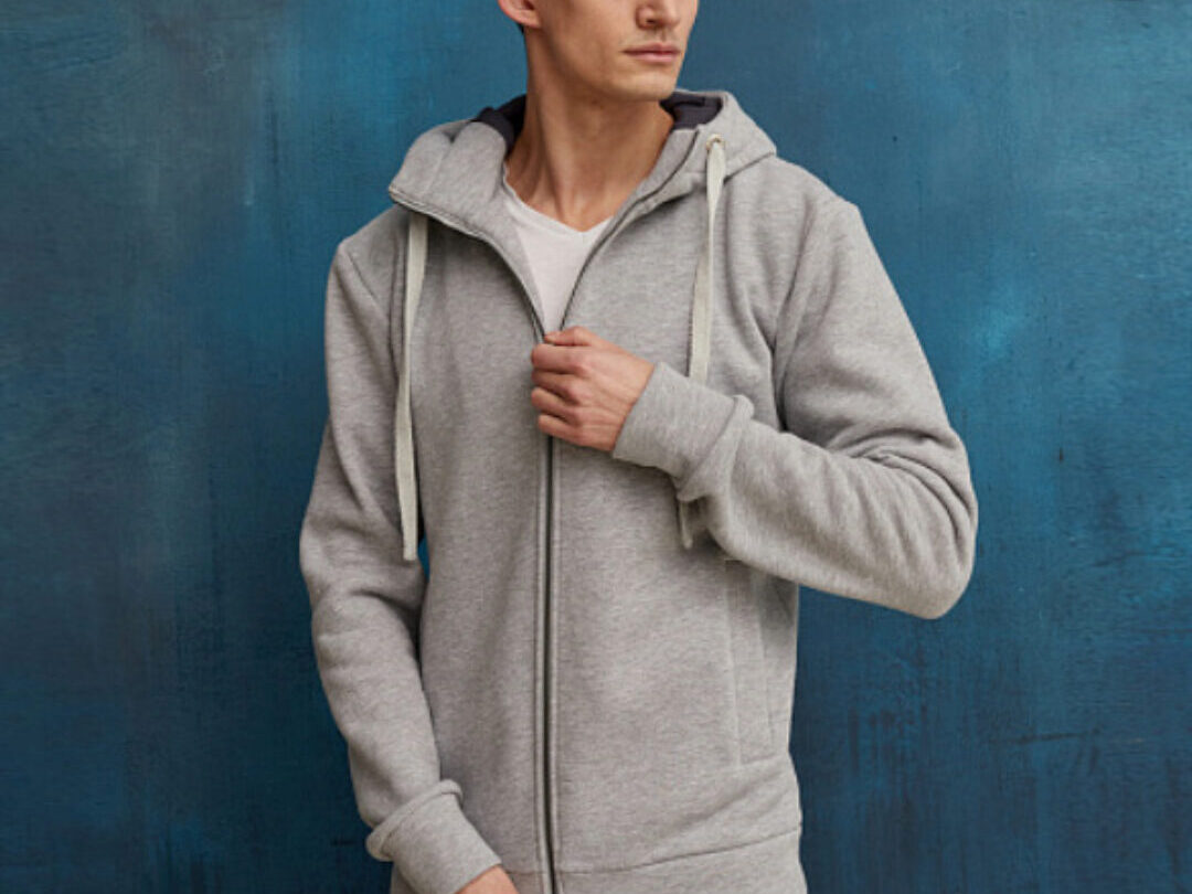 Мужская толстовка на молнии, среднего объема, прямого силуэта. На переде оформлены вертикальные карманы-листочки. Рукав рубашечный, плечо немного спущено. Низ обработан притачным поясом. Горловина обработана капюшоном с отверстиями для шнура. Низы рукавов обработаны притачными манжетами.