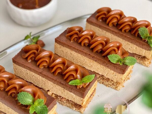 Медовый бисквит с хрустящим слоем пекан-кранча под бархатистым слоем сливочного мусса со шлейфом бельгийского шоколада