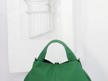 Для пошива сумки на фото было использовано: экокожа 520 г/м, для подкладки – искусственная замша 150 г/м, низкотемпературный спанбонд 170 г/м, пробивные кнопки альфа 12,5 мм, полукольца 20 мм.