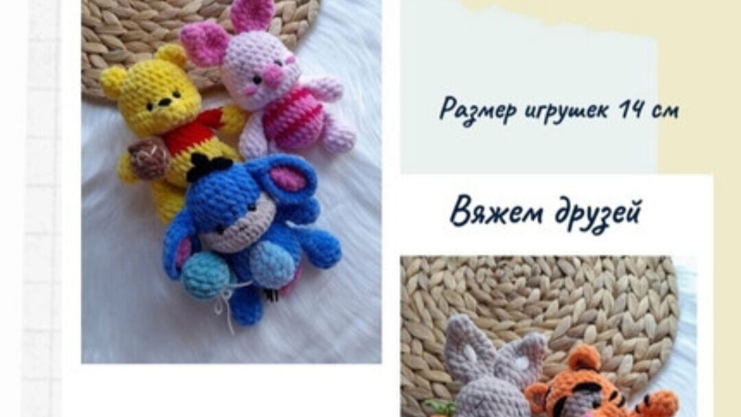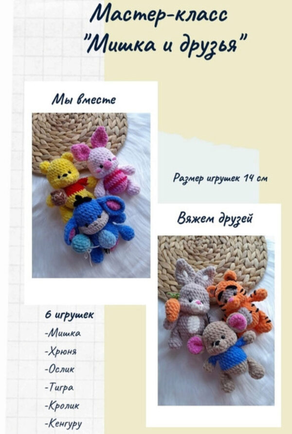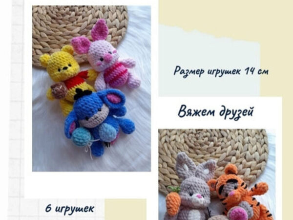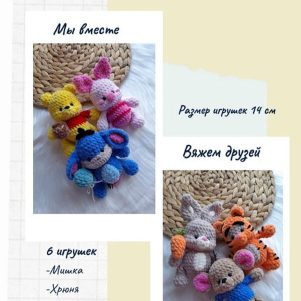 В мк входит описание 5 игрушек: Винни Пух, Пятачок, Тигра, Ослик Иа-Иа, Кролик. Ростиком 10 см. ПРИШИВАТЬ НИЧЕГО НЕ НУЖНО!