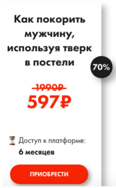 Вы получите Пакет «Бриллиант». Запись 9 занятий и онлайн-встреч. Для кого Вы прошли 1-ю ступень обучения; Хотите стать охотницей. Курс подойдёт для девушек, которые хотят сменить свой стиль сексуальной жизни, стать роковой женщиной, чтобы сводить мужчин наповал и стать желанной в постели. Спойлер: