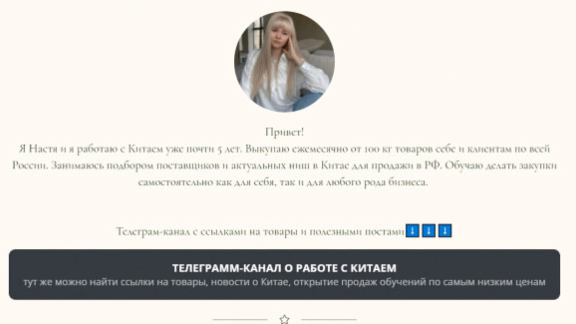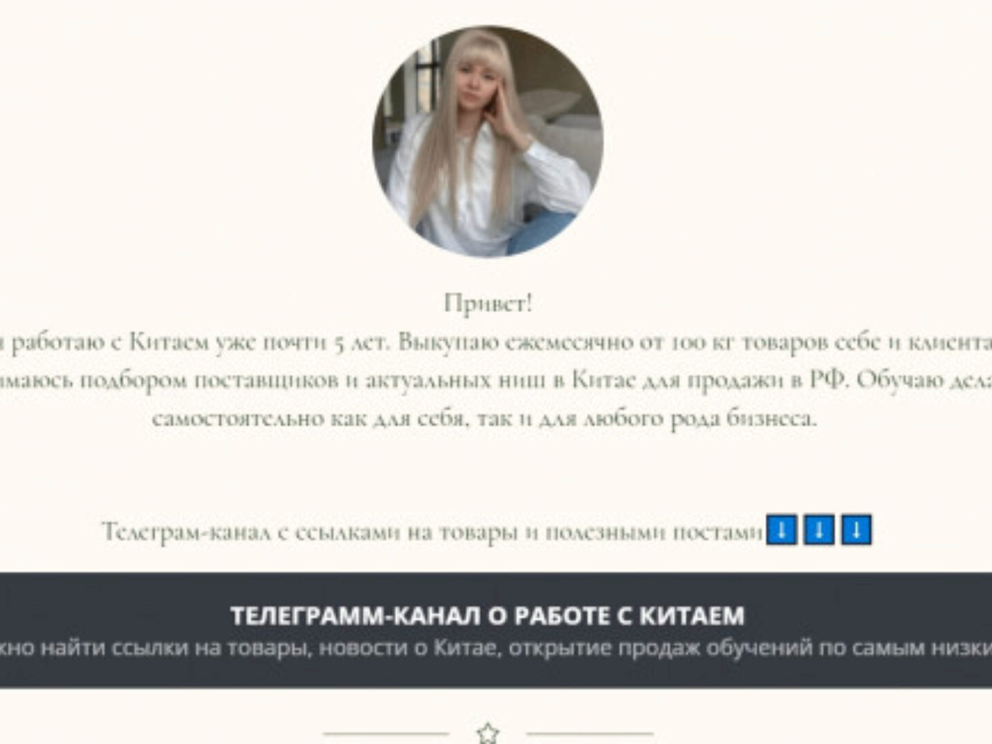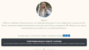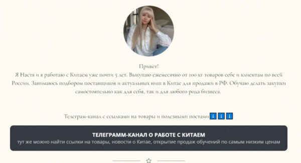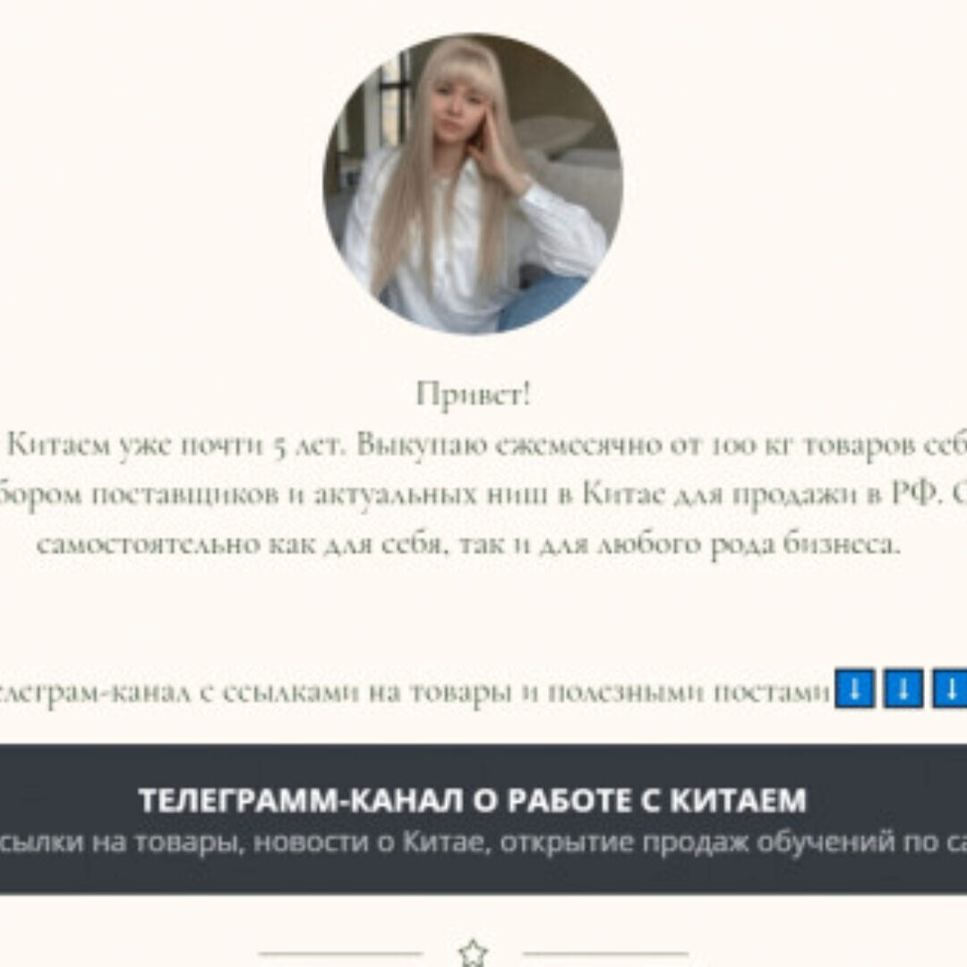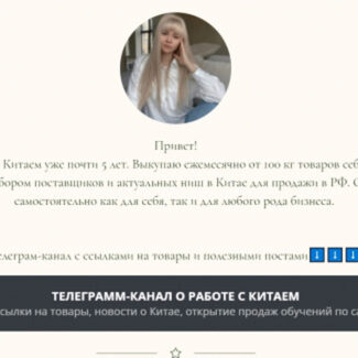 Меня зовут Инга. Я работаю с Китаем 8 лет, из них 2 года работаю как оптовик, выкупаю товары и оформляю доставку для своих клиентов. Я создала курсы по работе с Китаем и Турцией для тех, кто хочет: работать сам на себя научиться работать напрямую с фабриками без переплат для себя и своего бизнеса