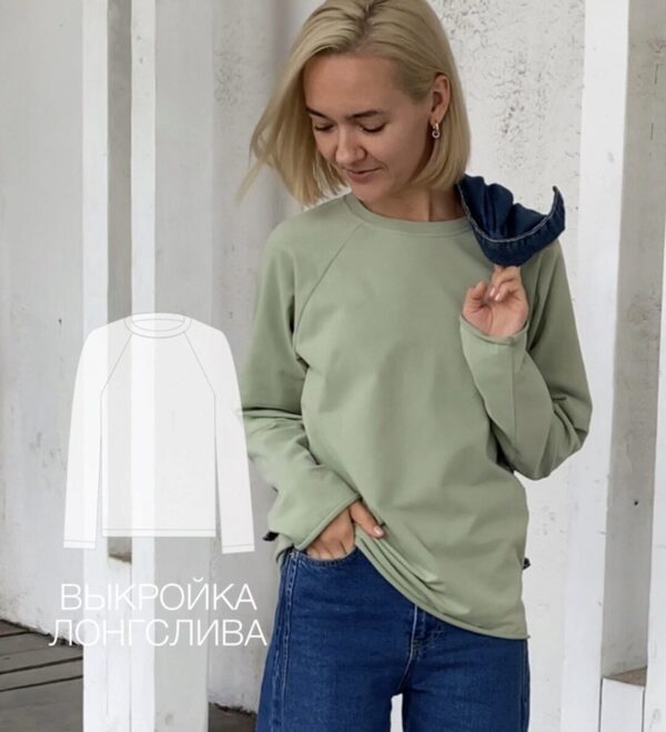 Выкройка лонгслива малого объема, прилегающего силуэта. Перед изделия состоит из двух частей. Между верхней и нижней частью переда фигурный вырез выше уровня груди. Рукав длинный (намеренно удлиненный), втачной. Горловина округлой формы, обработанная бейкой с открытым срезом. Длина изделия до линии