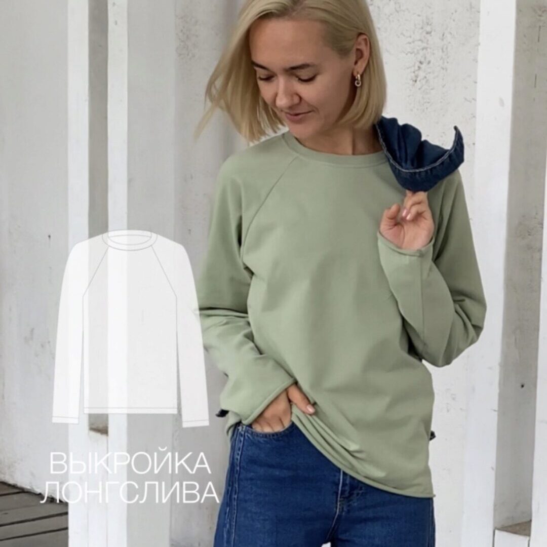Выкройка лонгслива малого объема, приталенного силуэта. Длинные втачные рукава. Вырез горловины обработан бейкой. Длина лонгслива чуть выше линии бедра. Модель Настя: ОГ 84, ОТ 64, ОБ 88, рост 171. Выбранный размер: 36. выкройка только для печати в формате А4