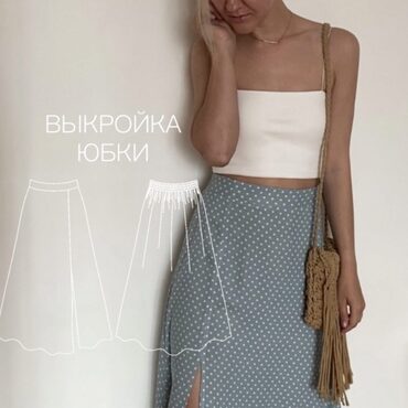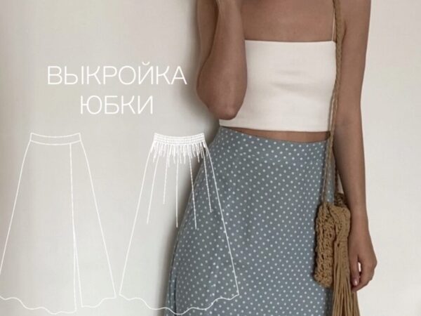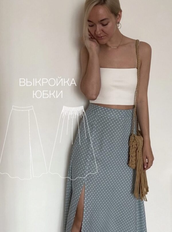 Выкройка юбки малого объема, легкого трапециевидного силуэта. Силуэт юбки образуется за счет косого кроя. На притачном поясе-резинке. В юбке использована люксовая обработка без использования оверлока: французским и московским швами. Длина изделия немного ниже колена. Предоставляется выкройка только