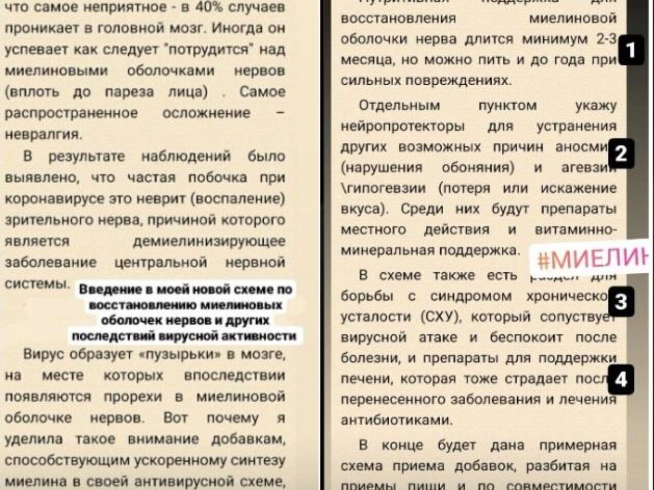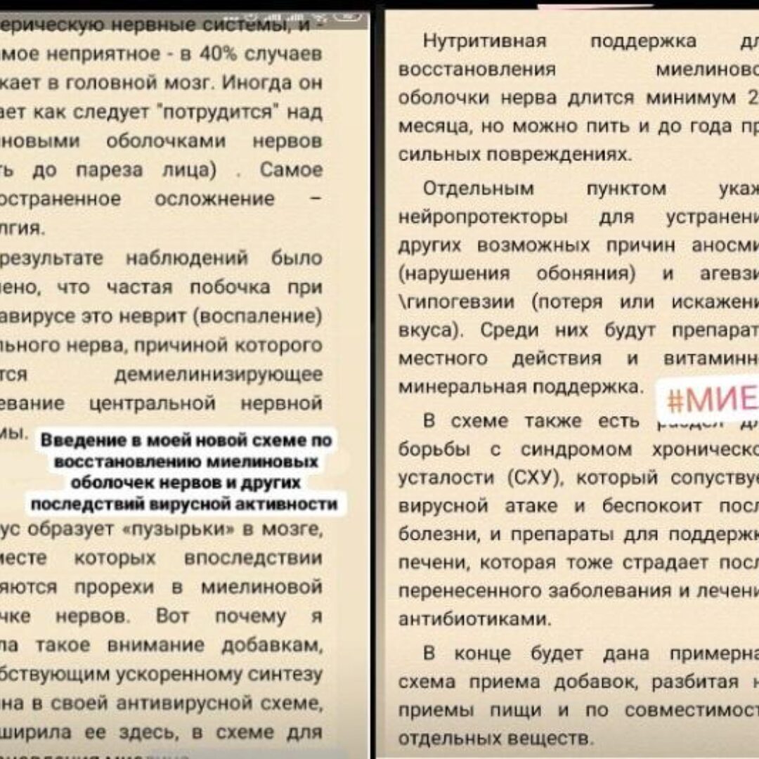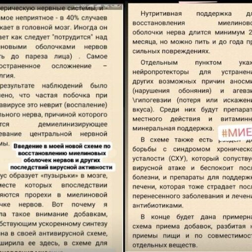 Схема представляет из себя протокол, включающий добавки для поддержки иммунитета, антивирусные препараты и препараты для восстановления миелиновых оболочек нервов. В первой части я даю список нутрицевтиков, которые использовала сама и которые мне нравятся по составу. Где возможно - указала аптечные
