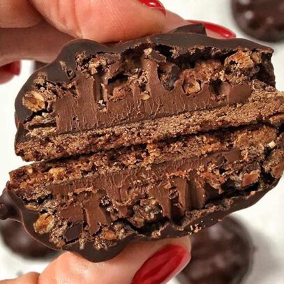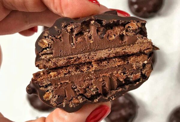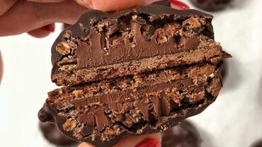 1. Печенье шоколадное, с шоколадным кремом и хрустящим шоколадным слоем с осколками какао-бобов в глазури из чёрного шоколада.