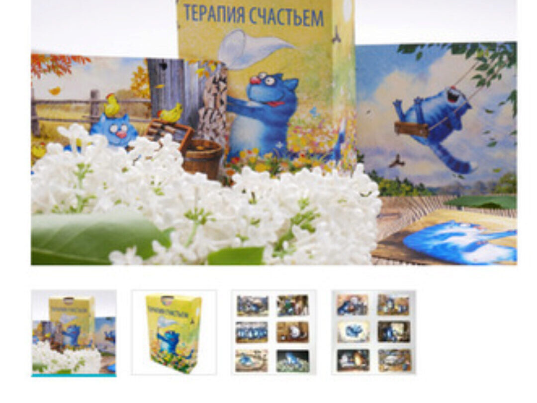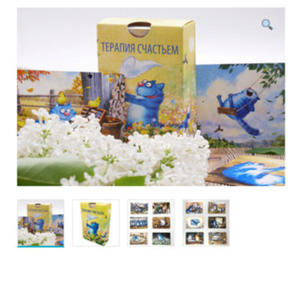 Перед вами колода «Терапия счастьем». Герой этих метафорических карт – СИНИЙ КОТ. Серия иллюстраций складывается в целое кошачье бытие, которое уводит зрителя в фантастический мир синих котов.