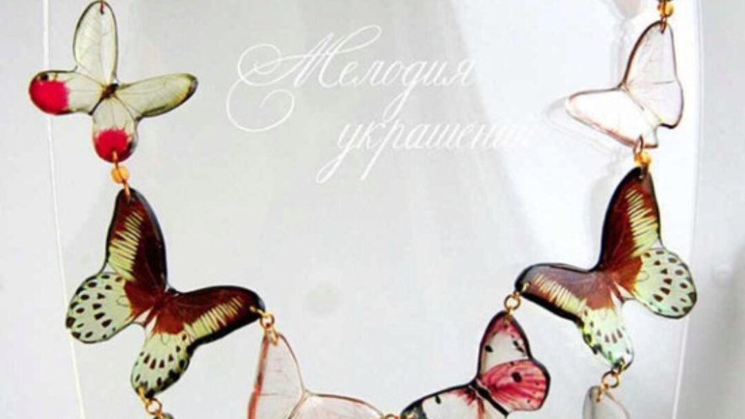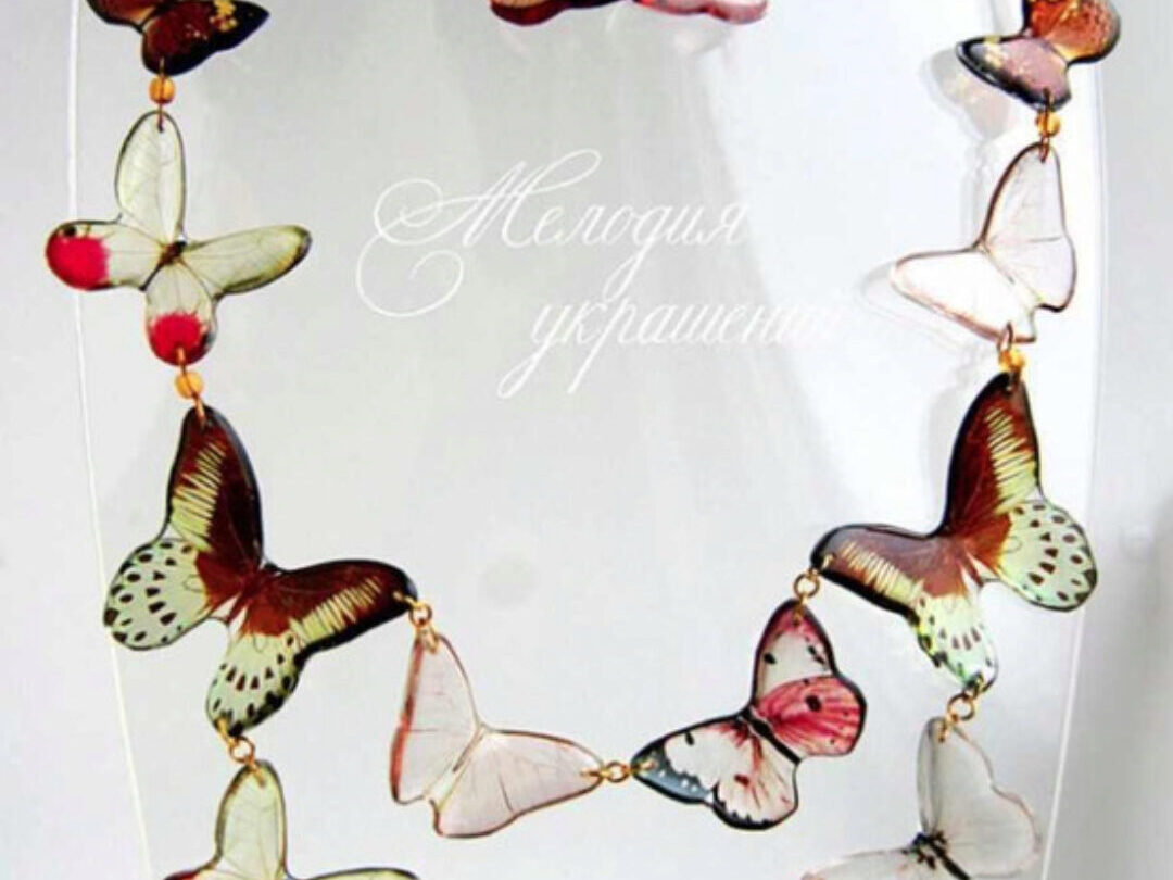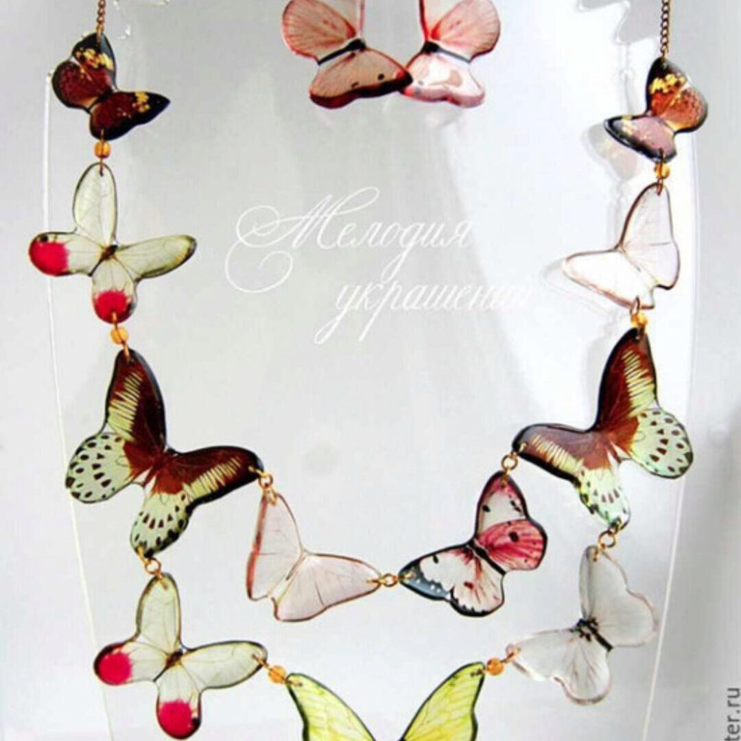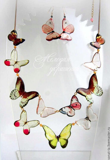 - создавать комплект с бабочками (колье и серьги), у которых крылья изогнуты естественным образом