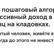 100 000 рублей в месяц пассивного дохода на кладовках - простая задача. Я расскажу вам, как сохранить деньги и достигнуть финансовых целей, инвестируя в кладовки. Получишь пошаговые инструкции с учетом ТВОИХ возможностей. Узнаешь, как выстроить финансовый поток с учетом ТВОИХ потребностей. Узнаешь