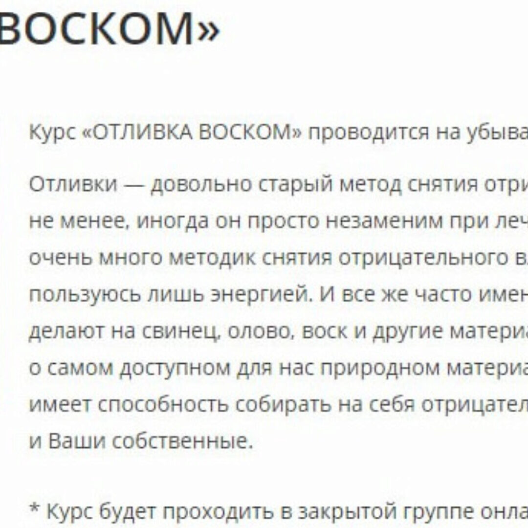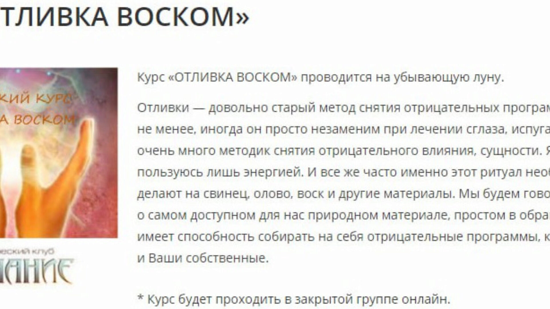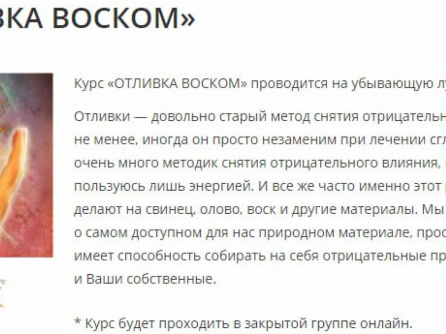 Программа курса: 1. Инструктаж, правила безопасности, технические нюансы. 2. Меры безопасности энергетического плана (защита во время работы, защита от перетяга и т.п.). 3. Техники отливки (есть различные методы выливания воском - мы рассмотрим основные). 4. Пример обрядов (для снятия негатива,