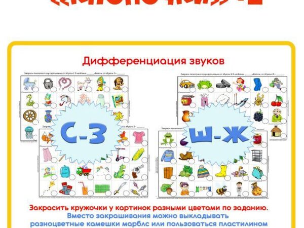 Задания на дифференциацию звуков С-Ш и Л-Р (по 2 листа на каждую пару) Закрасить кружочки у картинок разными цветами по заданию. Вместо закрашивания можно выкладывать разноцветные камешки марблс или пользоваться пластилином (для долговечности лучше заламинировать). файл в формате PDF, 4 страницы