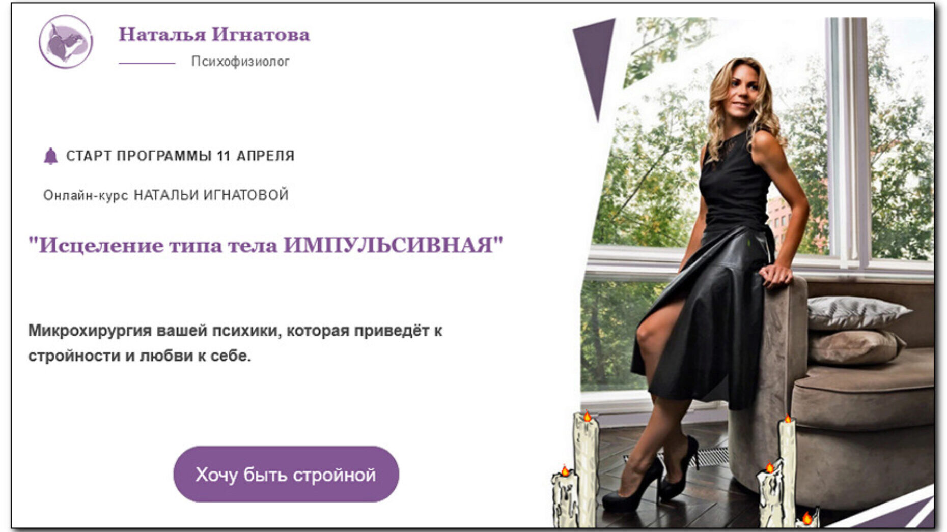 Старт потока - 30 мая 6-недельный практический курс по стройности Программа, на которой вы станете стройной, работая с головой Этот курс для вас, если вы: Уже давно не смотрели на себя с удовольствием Отчаялись постройнеть и хотите обрести пожизненную стройность Устали худеть на силе воле, считать