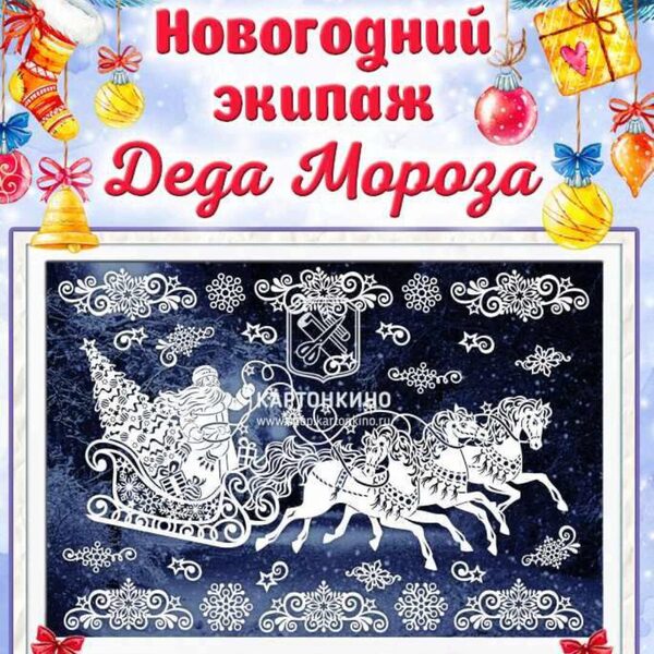 1. Компактный масштаб (для оконных секций шириной от 45 см): Дед Мороз и Снегурочка: 43,1×79,1 см; мешок с подарками: 38,3×41,9 см; игрушки: 43,4×36,2 см; колокольчики (верхний декор): 43,4×21,8 см; надпись «С Новым годом!»: 36,0×15,0 см; надпись «С новым счастьем!»: 40,8×12,0 см. 2. Базовый