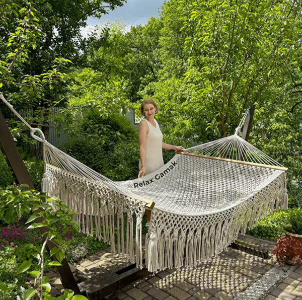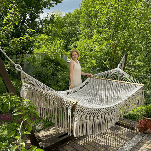 Гамак подходит для эксплуатации на улице. Шнур устойчив к воздействию ультрафиолета, не меняет своих качеств со временем и быстро сохнет при намокании. А каркас обработан маслом, которое защищает дерево от солнца и влаги.