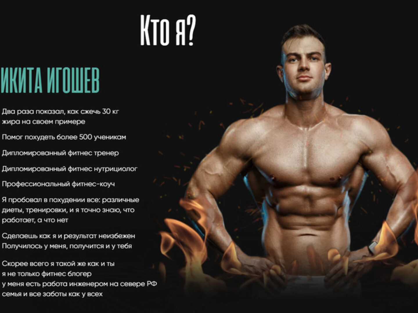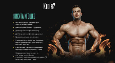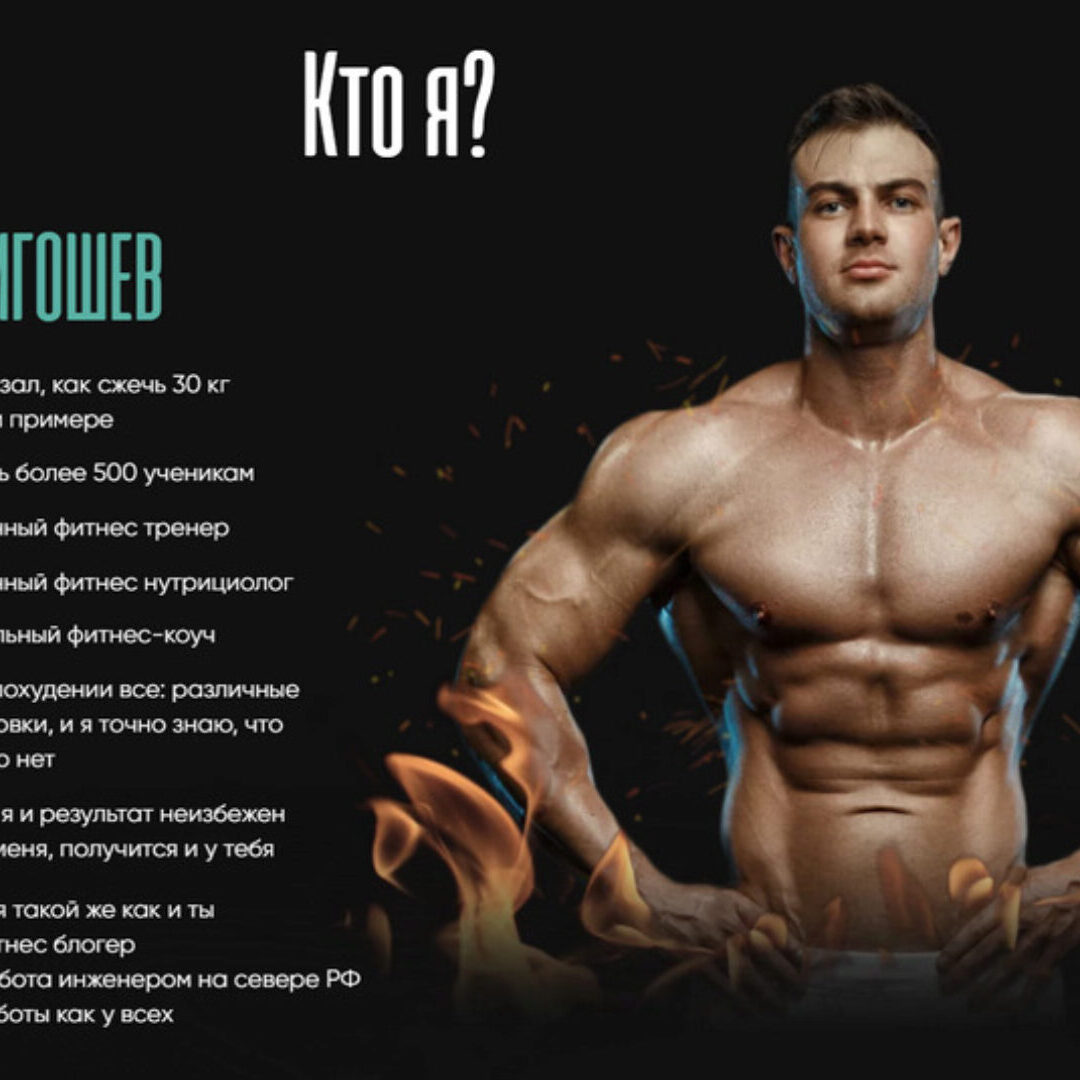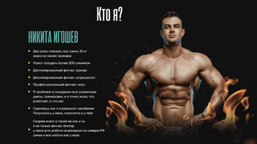 Кто я? НИКИТА ИГОШЕВ Два раза показал, как сжечь 30 кг жира на своем примере Помог похудеть более 500 ученикам Дипломированный фитнес тренер Дипломированный фитнес нутрициолог Профессиональный фитнес-коуч Я пробовал в похудении все: различные диеты, тренировки, и я точно знаю, что работает, а что