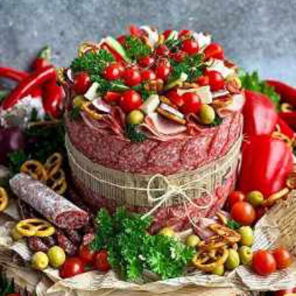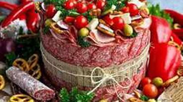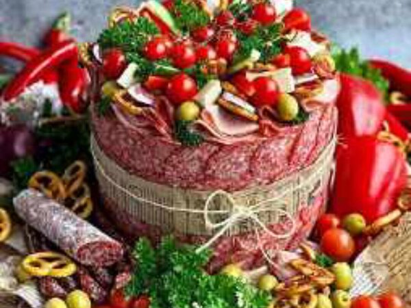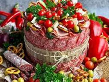 - Закусочный торт с мясными блинами и черносливом (Воздушные мясные блины, крем на основе чеснока, сливок и зелени, аппетитный обжаренный лук и добротный чернослив. В оформлении торта: колбаса «Салями» и еще 3 вида колбас, соленые крендели, помидоры черри, свежие огурцы, болгарский перец, зелень и сыр «Бри»)