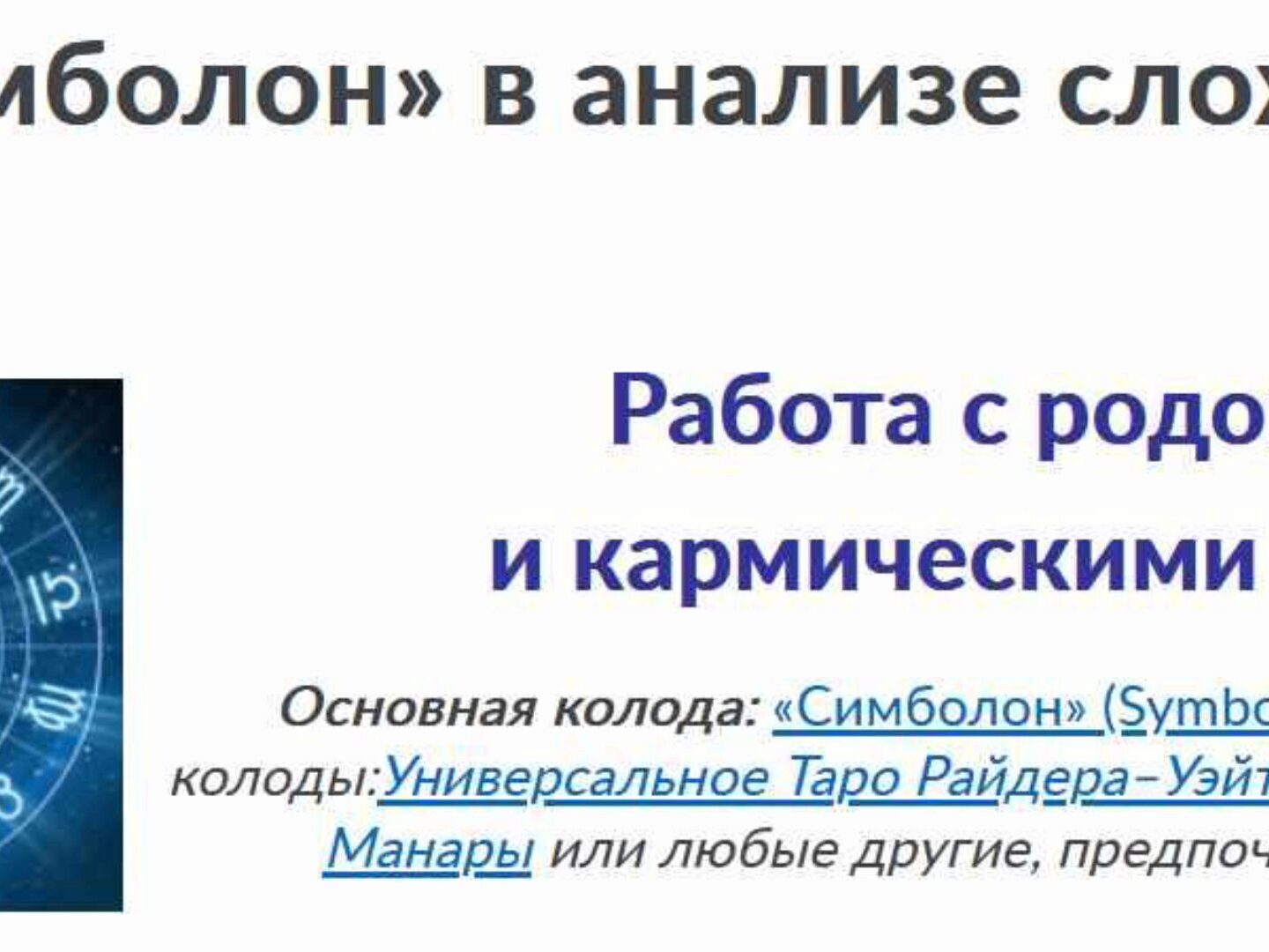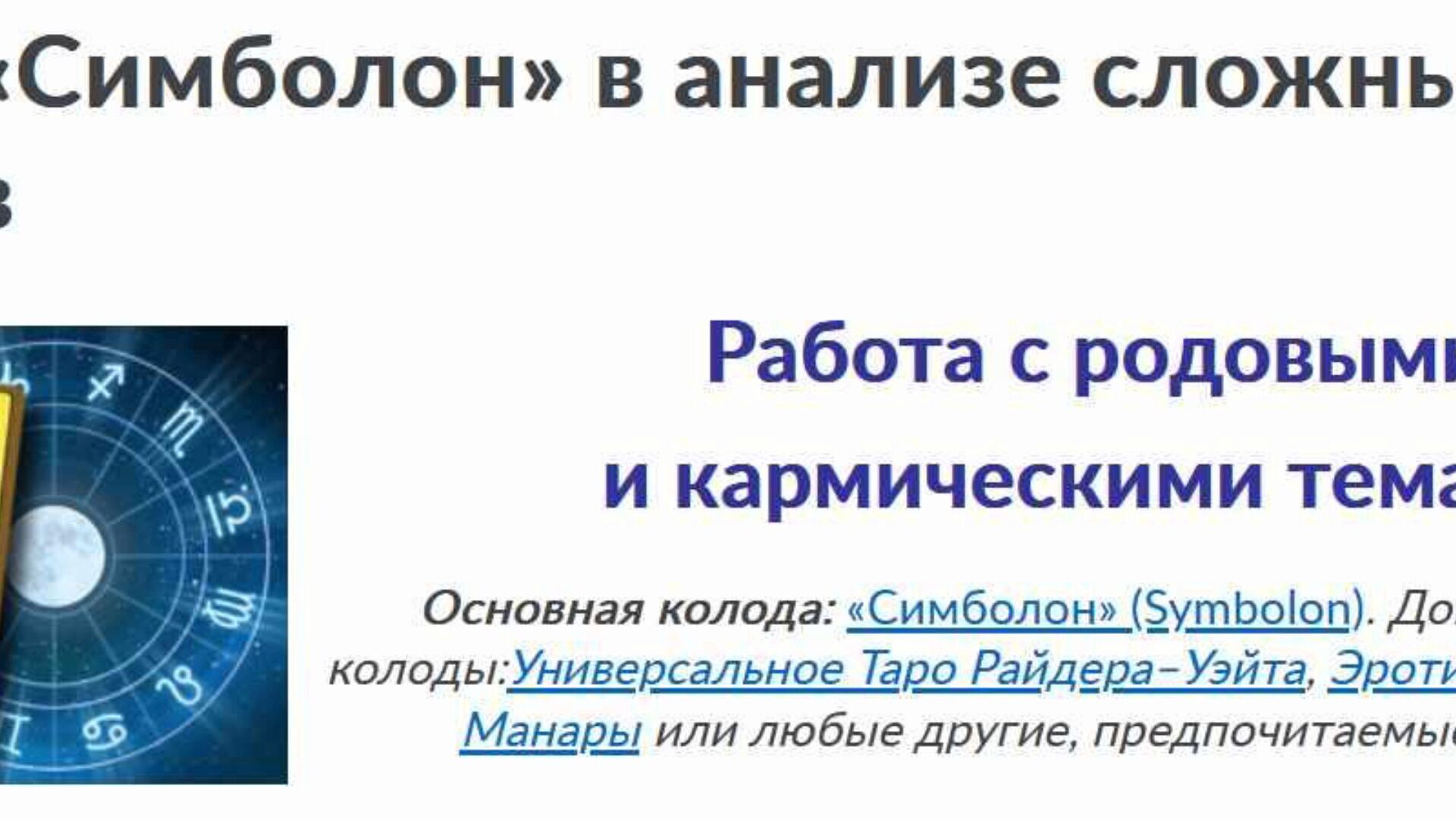 Мастер-класс посвящен использованию колоды «Симболон» при анализе сложных партнерских отношений в кармическом аспекте и при анализе родовых историй и их влиянии на сегодняшнюю жизнь человека.