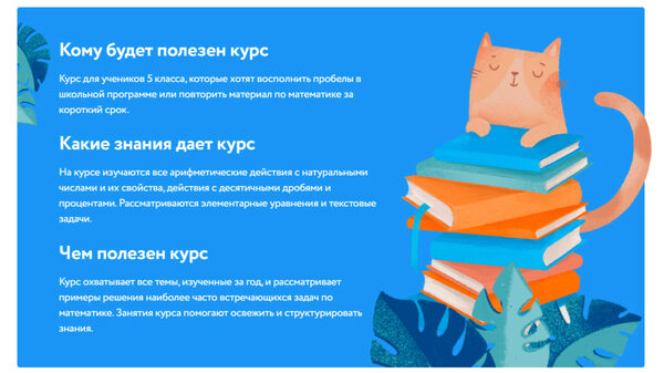 Кому будет полезен курс Курс для учеников 6 класса, которые хотят восполнить пробелы в школьной программе или повторить материал по математике за короткий срок. Какие знания дает курс На курсе изучаются все арифметические действия с рациональными числами и их свойства, действия с процентами.