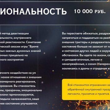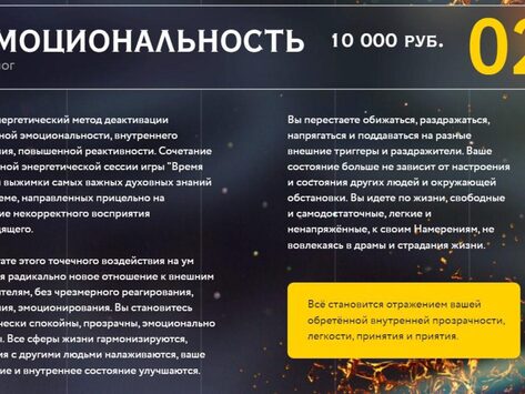 Эта сессия посвящена избавлению от страхов, тревог и внутренней скованности, для того чтобы совершить прорыв во всех сферах жизни. Ведь страхи — это главное, что мешает нам проявить свой потенциал на максимум. 30 минут сессии направлены на передачу не столько информации, сколько Энергетического