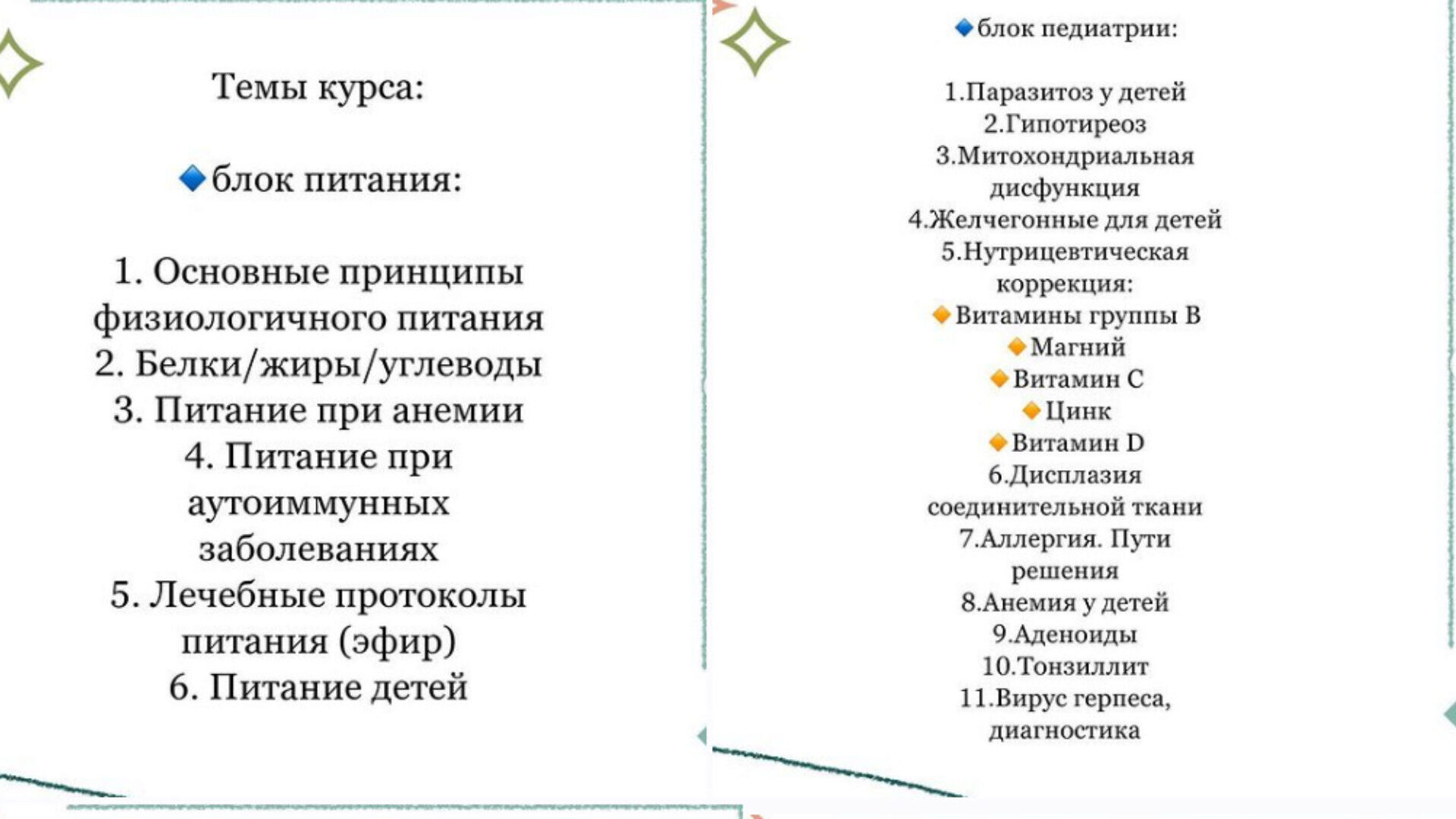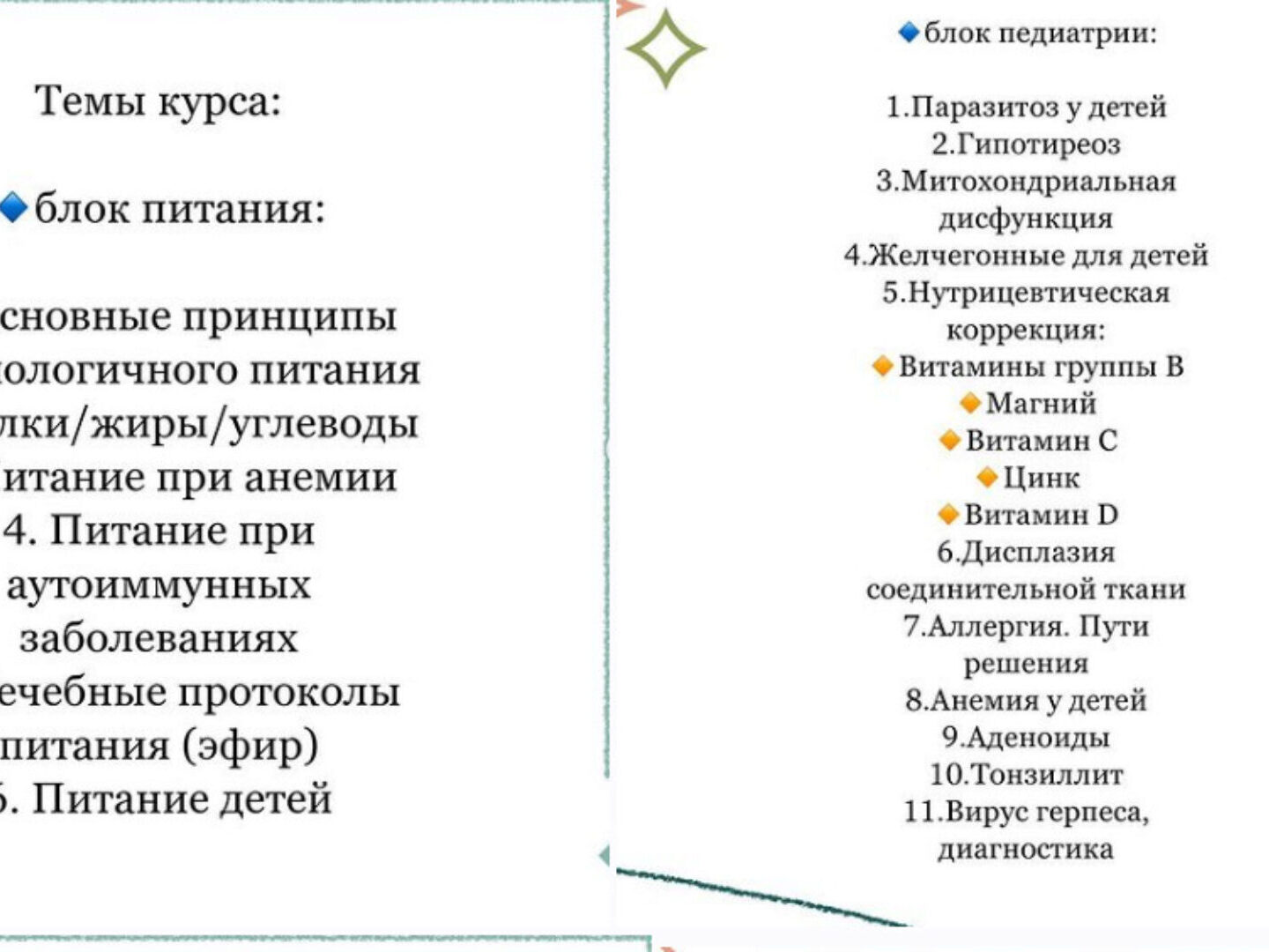 О курсе Данная образовательная программа создана на основе последних научных данных и охватывает как фундаментальную, так и прикладную часть. Программа адаптирована для новичков и тех, кто продолжает обучение в области питания. Процесс обучения построен таким образом, чтобы облегчить восприятие