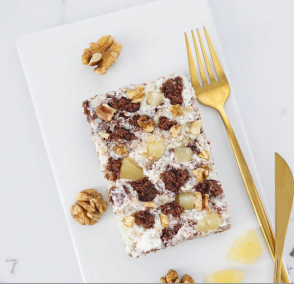 Все давно забытое старое возвращается в более усовершенствованном виде! Состав десерта: - Сочный, мегавкусный, бело-шоколадный бисквит с грецким орехом - Начинка - Персик - Специальный сметанный крем. - Выполнен в форме квадрата - Декор - цветок из изомальта.