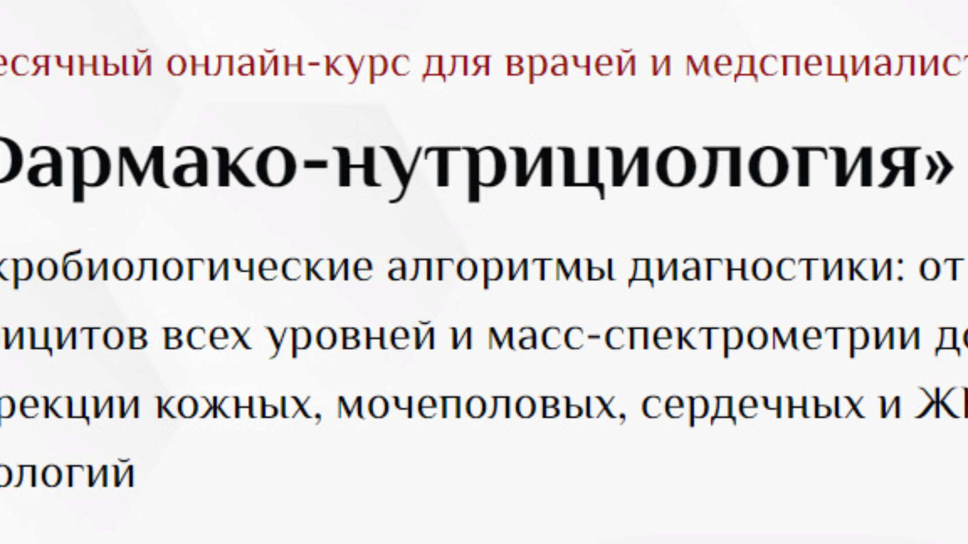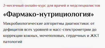 Курс «Фармако-нутрициология» — это высший профессиональный уровень работы врача с микрофлорой и дефицитами для помощи пациентам. Анализы—клиническая картина—диагноз—препараты—результат. Хотите стать на голову выше коллег?