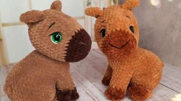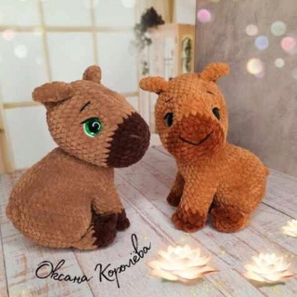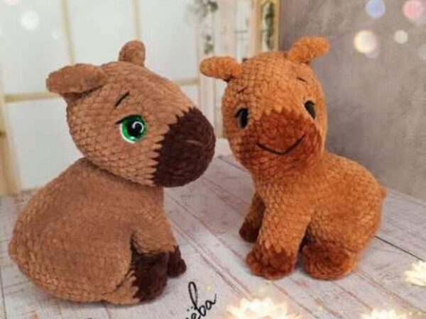 Капибара вяжется очень быстро, без единой пришивной детали, тело ввязывается в голову, ушки надвязываются сверху на готовой игрушке. Пряжи требуется минимум, на одну игрушку понадобится всего лишь 25-30 грамм пряжи. Размер игрушки 10см в длинну, в зависимости от пряжи, номера крючка и плотности