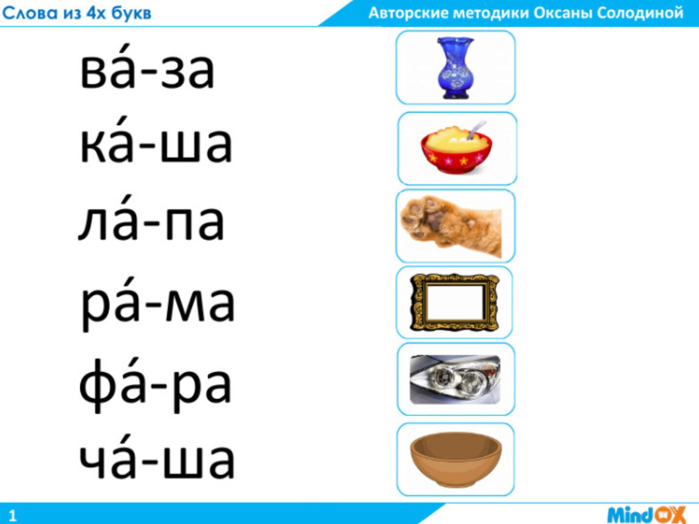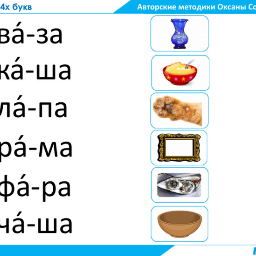 256 слов сгруппированы в соответствии со структурой слова (32 страницы PDF) Упражнение для выхода в чтение — узнавание всегда предшествует осознанному воспроизведению. Развитие фонематического слуха — основа грамотного письма и профилактика дисграфии. Наличие изображений формирует у ребёнка связь