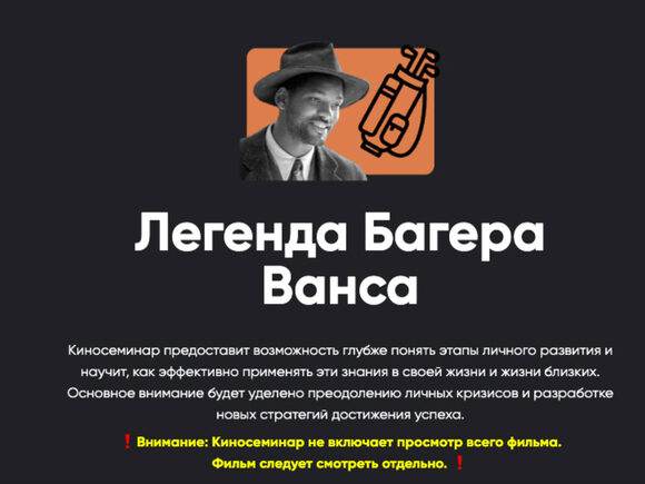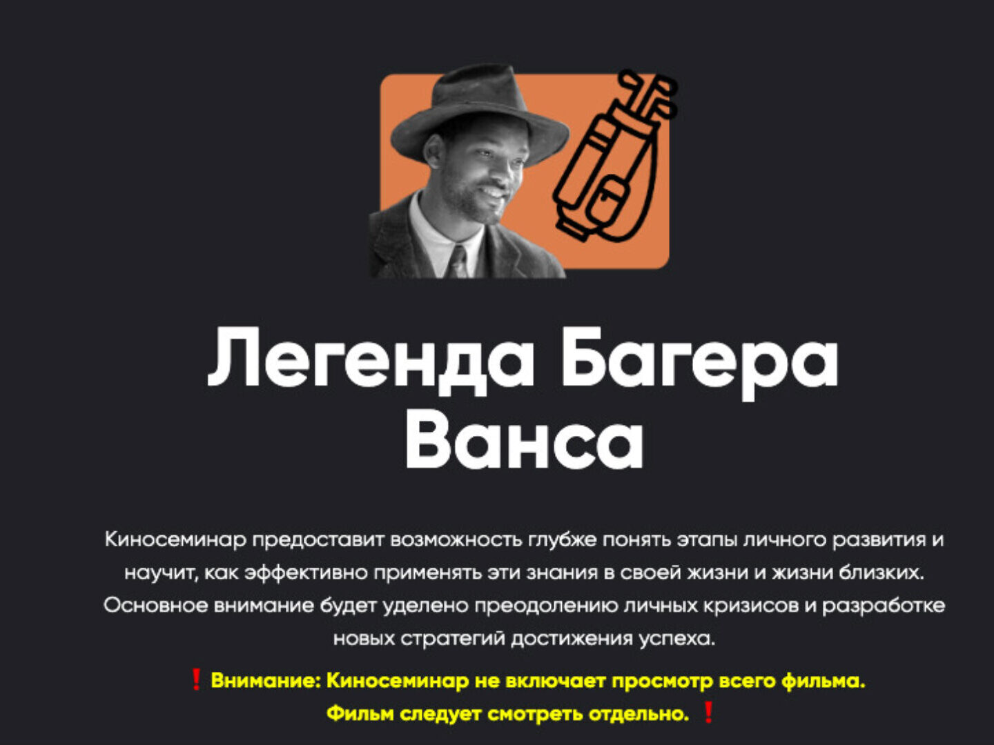 На киносеминаре вы углубите свои знания из базового курса «Стратегия жизни», получите новую информацию и уникальный опыт, который объединяет психологию, стратегию и искусство кино. Фильм поможет увидеть в его героях себя и свои жизненные ситуации, что сделает киносеминар мощным инструментом для разработки вашей личной стратегии успеха.