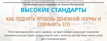 После прохождения этого касто-марафона вы будете владеть уникальной технологией мышления успешных людей, которая позволит вам с легкостью достичь самых смелых целей уже в ближайшее время