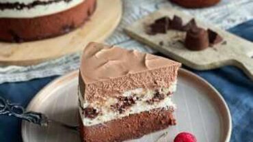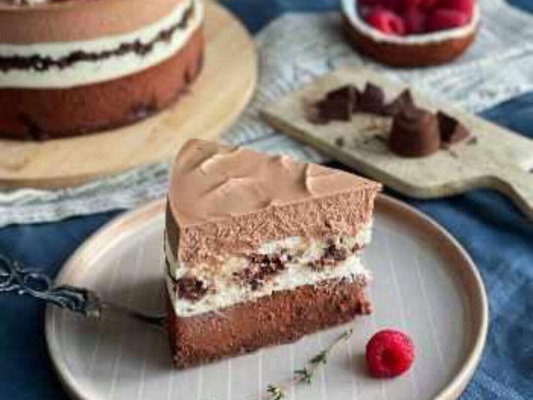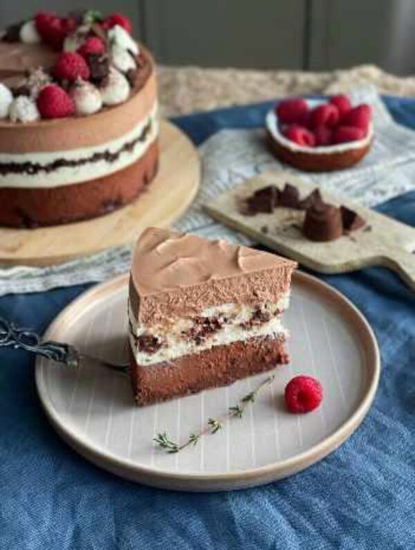 Сочный шоколадный бисквит и нежный бархатный мусс на основе крема «баваруаз», который слой за слоем становится более насыщенным! Я думаю многие знакомы с этим тортом и в рекламе он не нуждается, поэтому я лишь отмечу в чем отличие моего варианта от многих других рецептов: — Не приторный! Очень