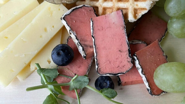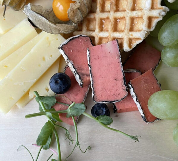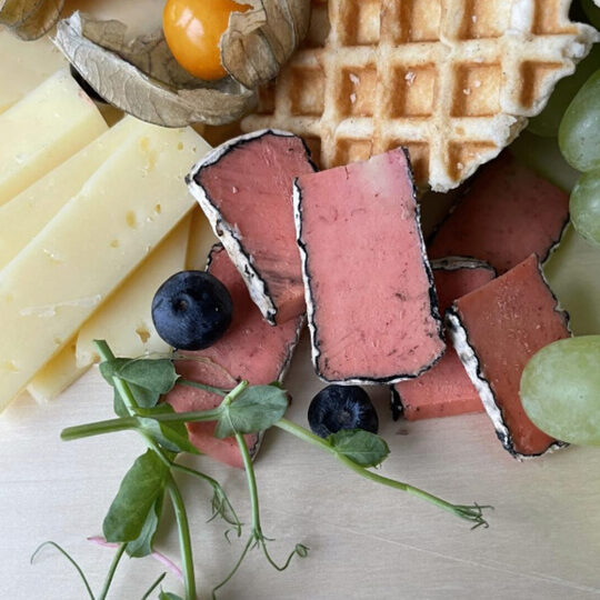 Необычный сыр розового цвета в нежной корочке из золы, покрытый белой плесенью.