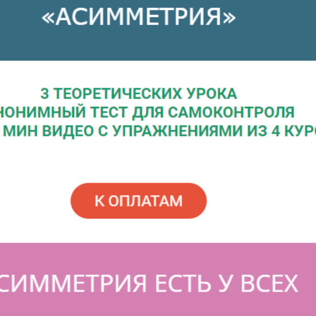 СТАРТ программы оМОЛОЖЕние по теме АСИММЕТРИЯ ЛИЦА Цель программы: скорректировать асимметрию лица и тела Что вас ждет? Локальные комплексы, которые помогут вам расслабить и восстановить положение челюсти. Вы научитесь приемам работы с несимметричной мимикой: мы будет работать со слепыми зонами и