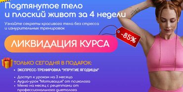 Вы получите на курсе Стройное тело: 20 тренировок в личном кабинете 10 лекций от нутрициолога план питания на 4 недели с рекомендациями и рецептами видеоуроки «Массаж живота» курс Интимные мышцы: 7 тренировок + гайд курс Здоровая спина: 10 тренировок + как убрать холку курс Фейсфитнес для мам 3