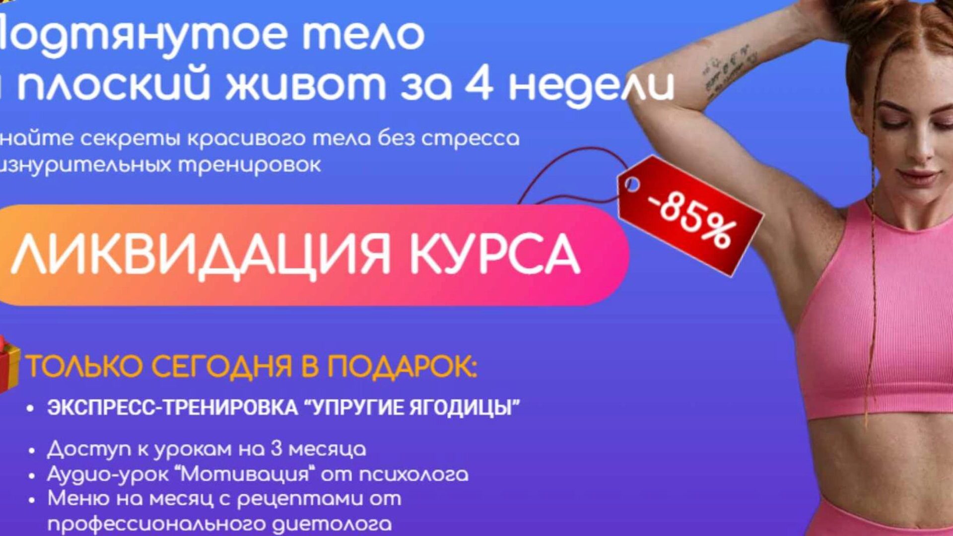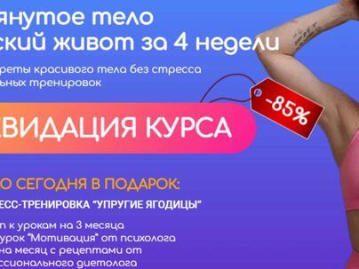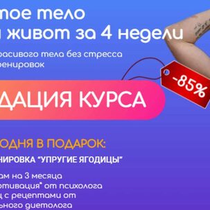 Упругие ягодицы и плоский живот за 30 минут в день Что входит в курс: 20 авторских тренировок Рацион питания с КБЖУ Большая книга рецептов Бонусы: Курс «Йога для мам» Супер сет «Здоровая спина» Медитация любви к себе Вебинар с психологом «Как бороться со срывами» Гайд "Антицеллюлит На курсе вы