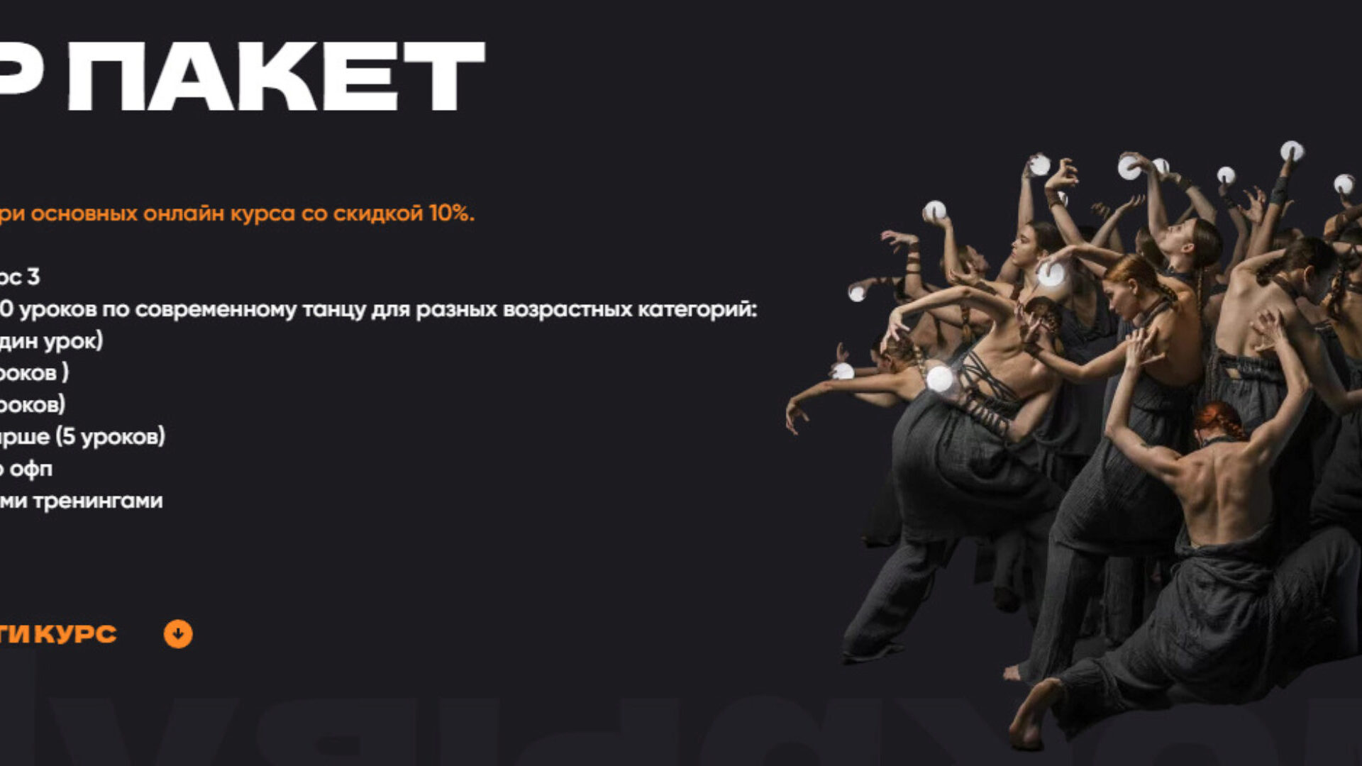 В пакет входит три основных онлайн курса (Курс 1, Курс 2, Курс 3) от Дом танца кувырком