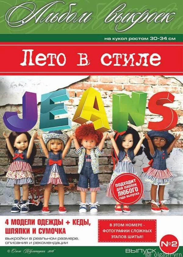 Альбом в электронном формате (PDF-файл) на 20 страницах А4 содержит выкройки в реальном размере на кукол ростом 30-34 см, фотографии и подробное текстовое описание (материалы, раскрой, порядок работы). Во второй выпуск вошли выкройки 4 комплектов из новой коллекции «Лето в стиле JEANS». Я учла ваши пожелания и во втором выпуске добавила к описаниям фотографии сложных этапов шитья.
