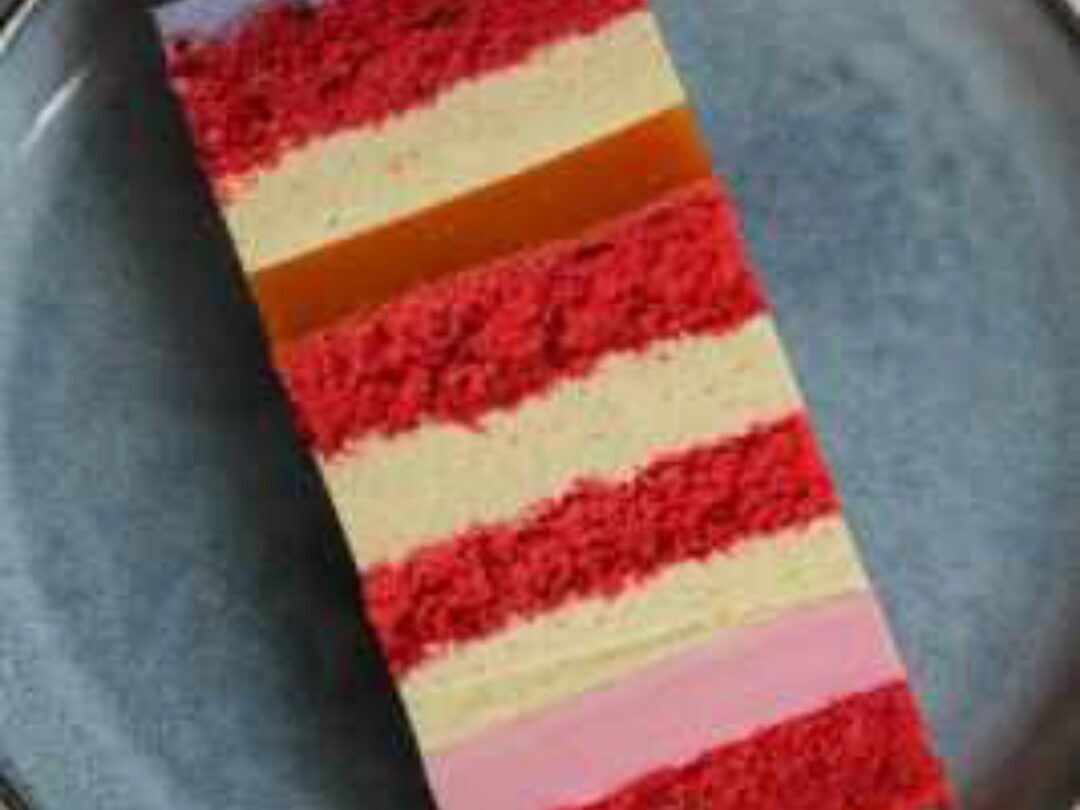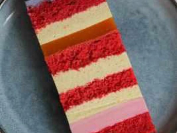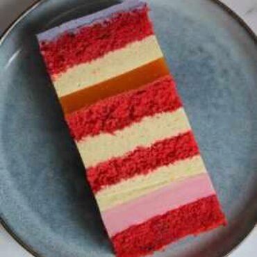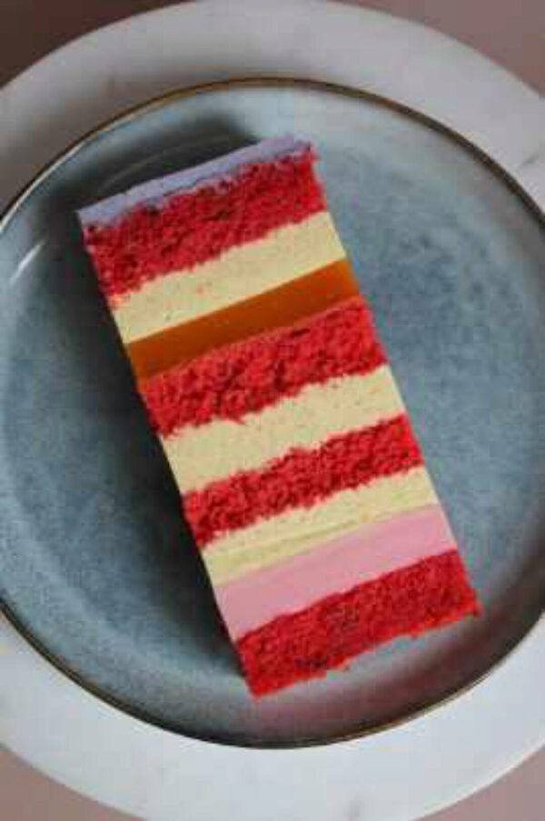 Муссовый торт «Бургер»: Низ булочки: шоколадный бисквит, хрустящий слой, ванильный мусс. Сборка в крышке формы «Эклипс» Помидоры: апельсины, томленые с ванилью в брусничном соусе Котлета: пирожное «Шоколадная картошка», покрытая нейтральным гелем Сыр: желе из манго Кетчуп: клубнично-брусничный соус