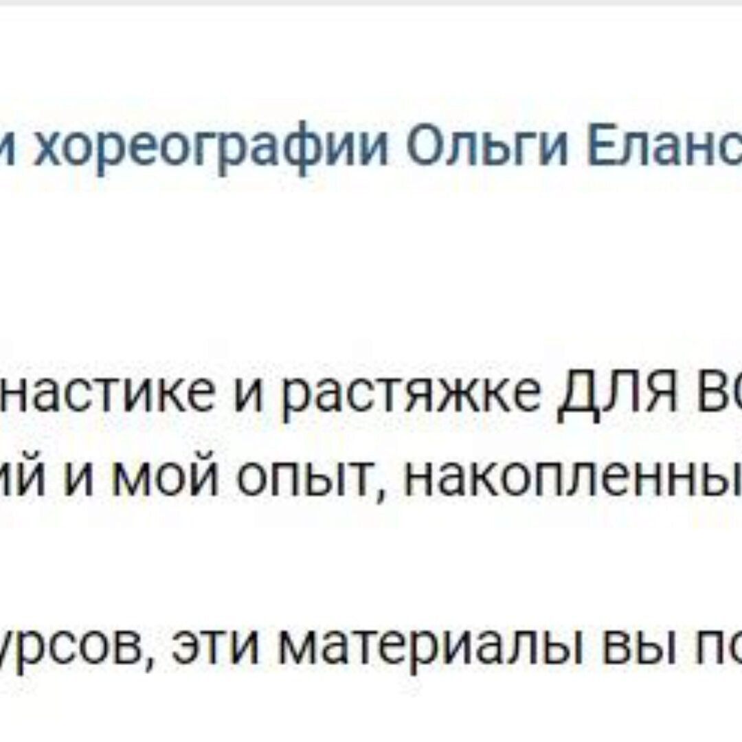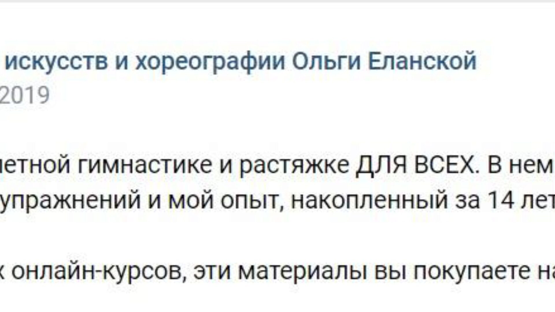 Онлайн-курс растяжки и балетной гимнастики Ольги Еланской Курс состоит из балетной гимнастики и растяжки. Прорабатывается раскрытие бедер, выворотность, высота шага, пресс, спина, мышцы кора. Курс не имеет четкой программы, но есть несколько видео, разных по длительности. Курсы у Ольги все разные,